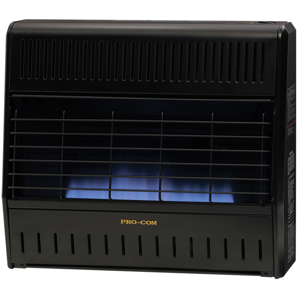 ProCom Heating Vent Free Blue Flame Garage Heaters are designed specifically for garage applications. These vent-free gas space heaters make supplemental heating fast and easy! Just push a button for easy ignition, stand back and enjoy a great source of dependable, affordable heat. Blue flame gas heaters heat the air first, circulating the warmth through the room, much like your central heating system. This is the updated version of ProCom Model MD300TGA.