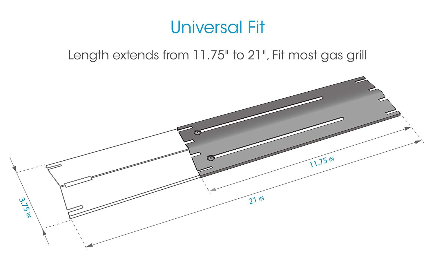 - Set of 4 Porcelain Steel Flame Tamers. Extends from 11.75” up to 21” long, 3.75” wide, fits most gas grills. If installed reversely, the length will be extended from 11.75” to 18.37” long.