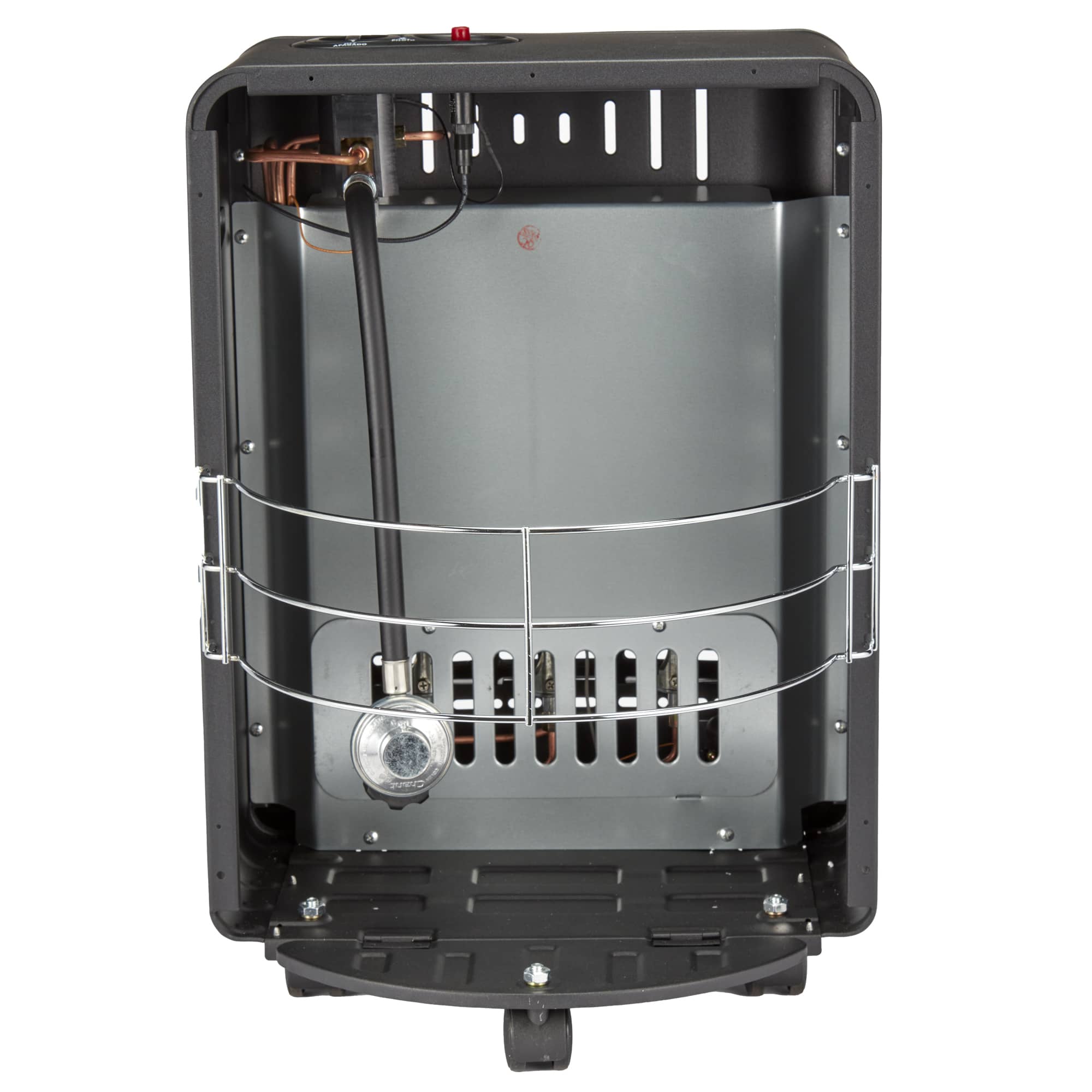 With three heat settings—6,000, 12,000, and 18,000 BTUs—it can comfortably heat spaces up to 450 sq. ft. Simply connect a standard 20 lb. propane tank using the included hose and regulator, store the tank neatly inside the cabinet, and ignite using the push-and-turn knob with integrated piezo ignition.
