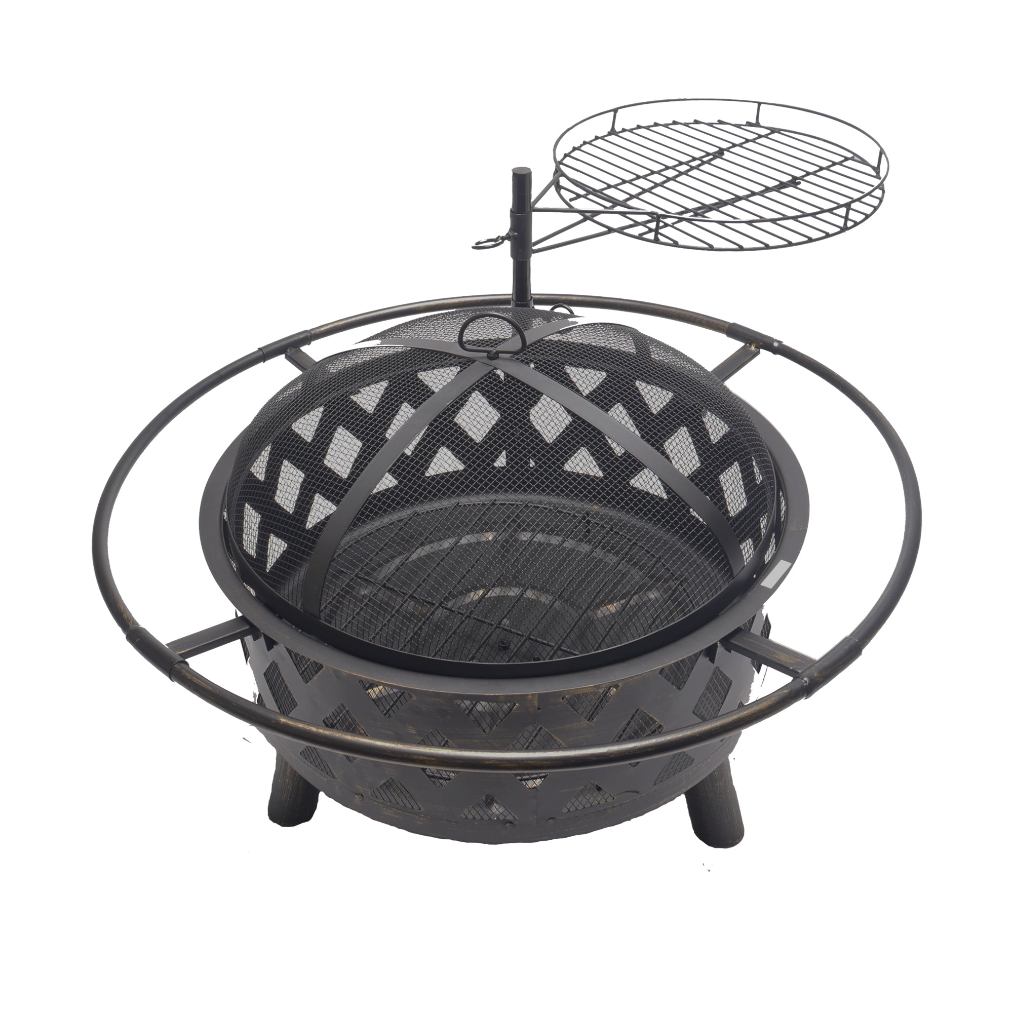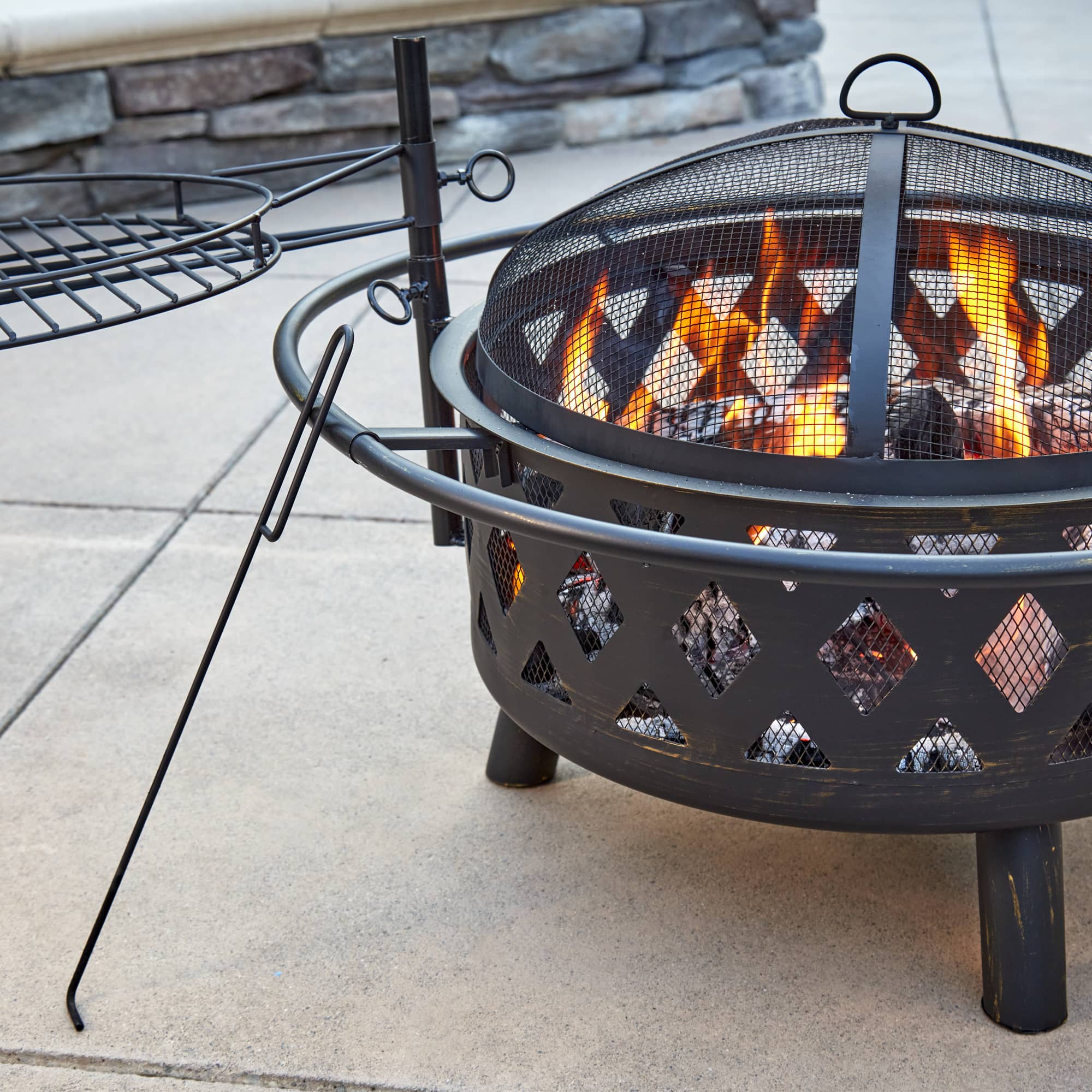 The 30 in. Roadhouse Steel Wood Burning Fire Pit from Bluegrass Living is ideal for a robust backyard fire or barbecue. Beautiful handcrafted decorative moldings embedded in a rich, oil-rubbed bronze finish is sure to make an impression and add an elegant décor to any outdoor space. While entertaining or enjoying your fire pit, use the included 360-degree cooking grid with adjustable height swivel to barbecue up something special.