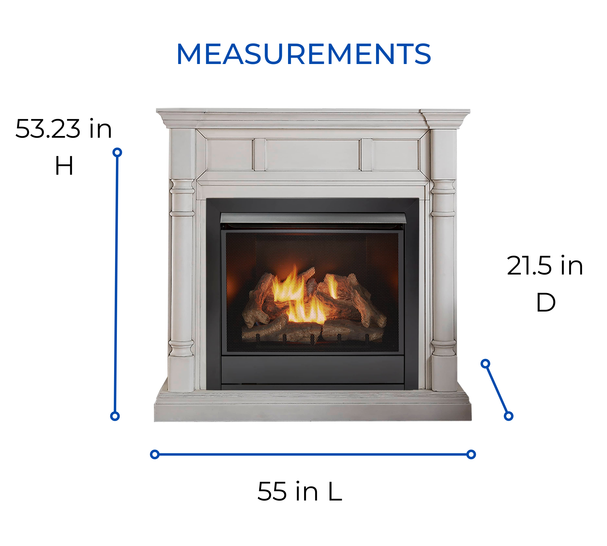 The Duluth Forge Ventless Fireplace (FDI32R-M-AW) provides a beautiful and realistic flame. It features realistic fiber ceramic logs for a stunning home experience. Make your house feel like home with our Furniture Grade Quality Fireplace Mantel and Full-Size Duluth Forge Dual Fuel Ventless Gas Fireplace Insert. The product is made to produce up to 32,000 BTU of heat, enough to heat 1,500 square feet of living space. The antique white finish creates a nice contrast that completes the look of your home.