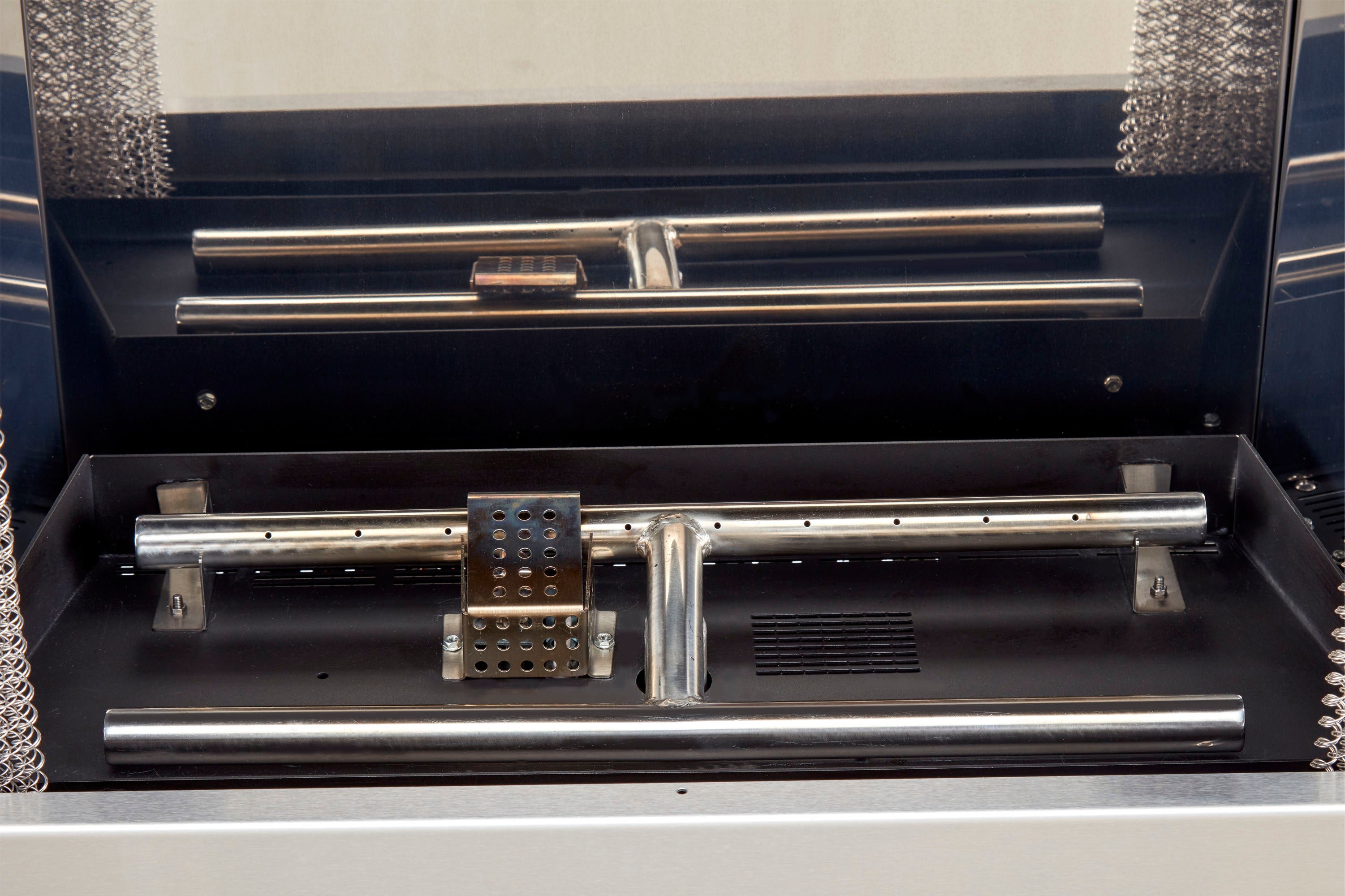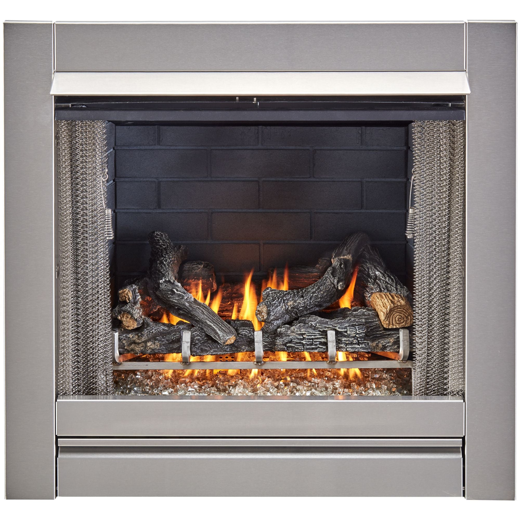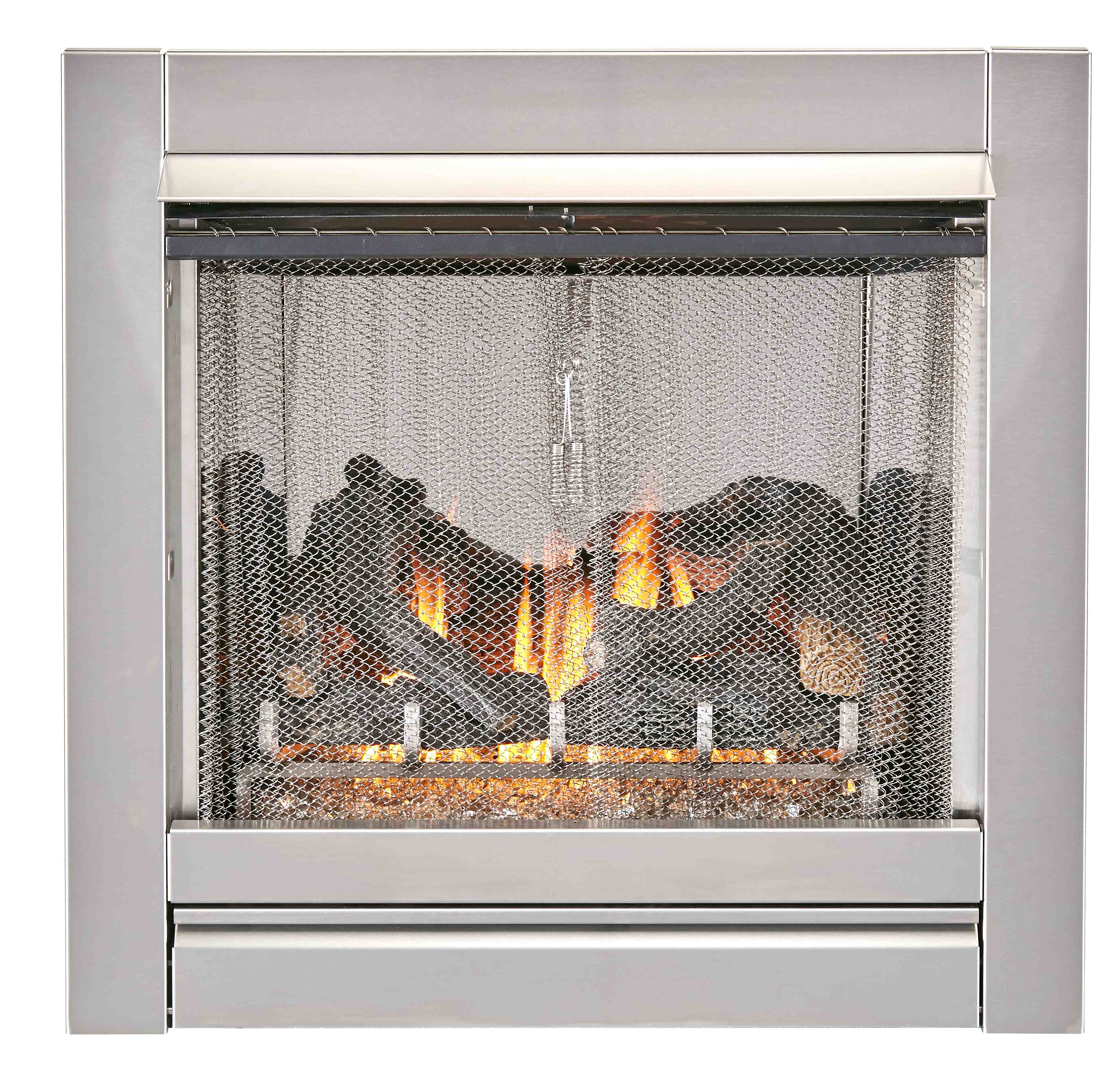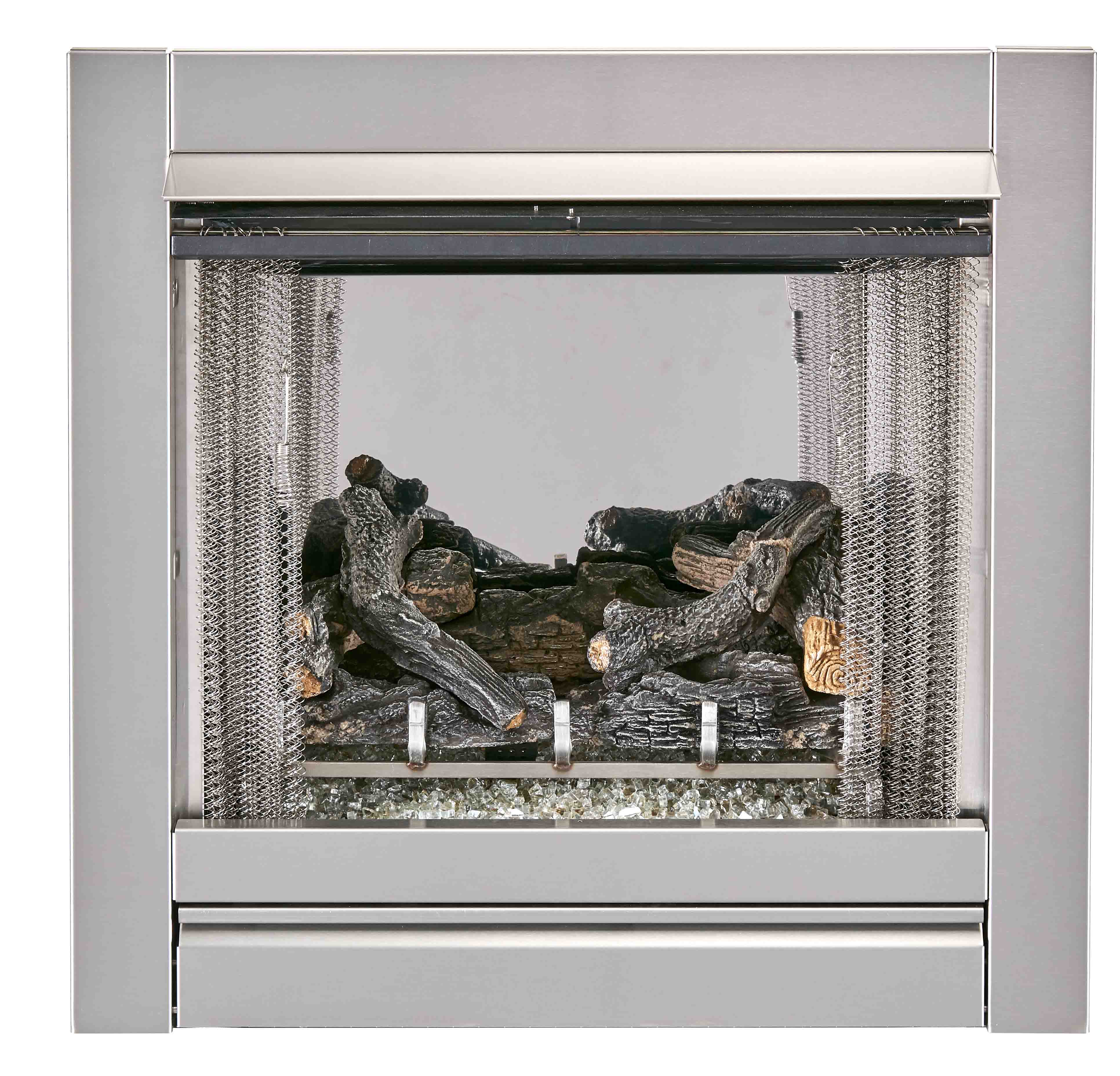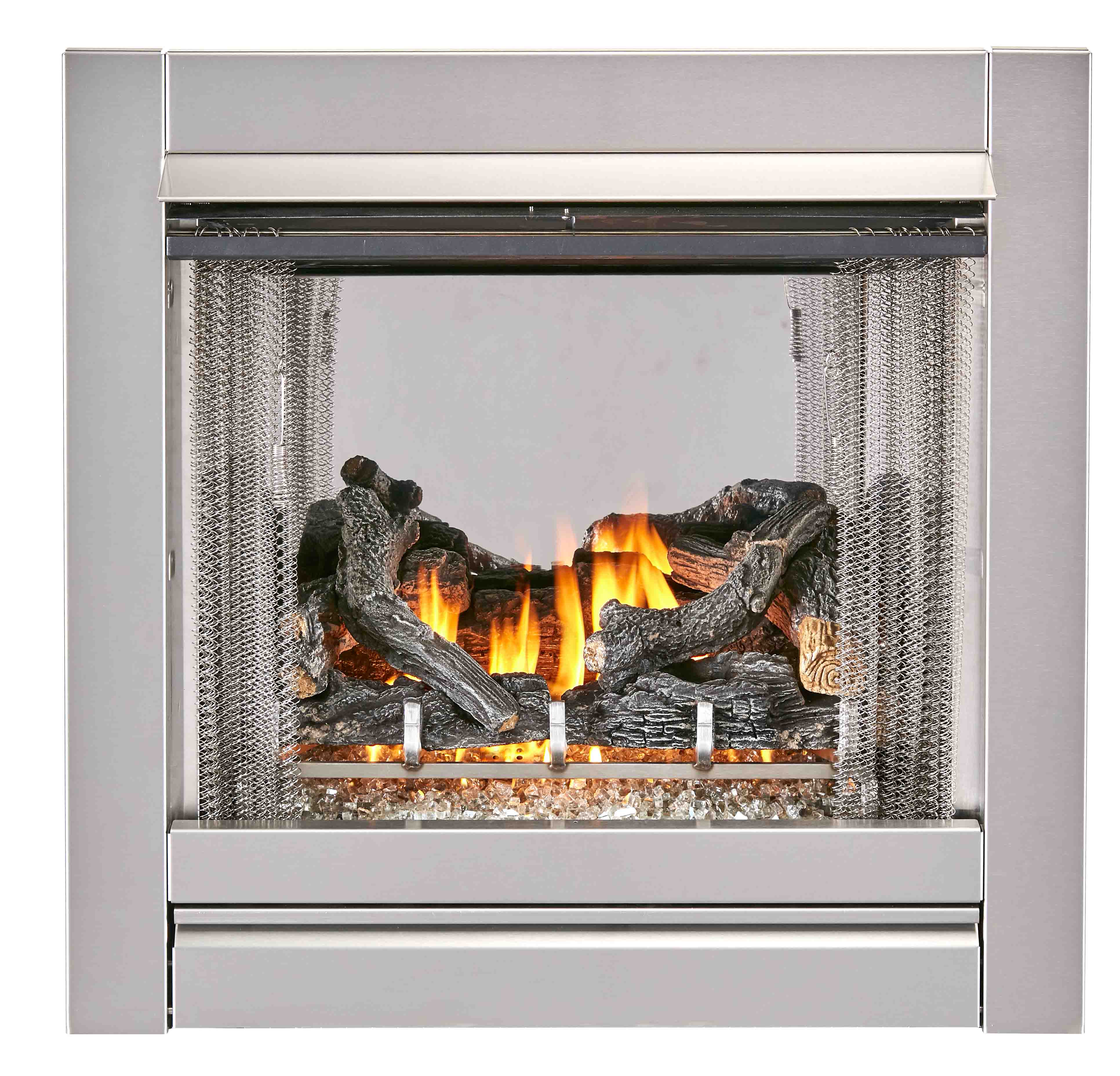 The fireplace front panel has a brushed stainless finish that will enhance any patio or outdoor living room. The inner firebox panels are made from a bright reflective stainless steel that “mirror” the flames on all sides of the firebox allowing you to enjoy your outdoor gas fireplace from various angles. You and your family members can relax and enjoy your new outdoor living space while you watch the flames dancing through the logs and the large glowing bed of reflective crystal fire glass media that comes standard with your fireplace.