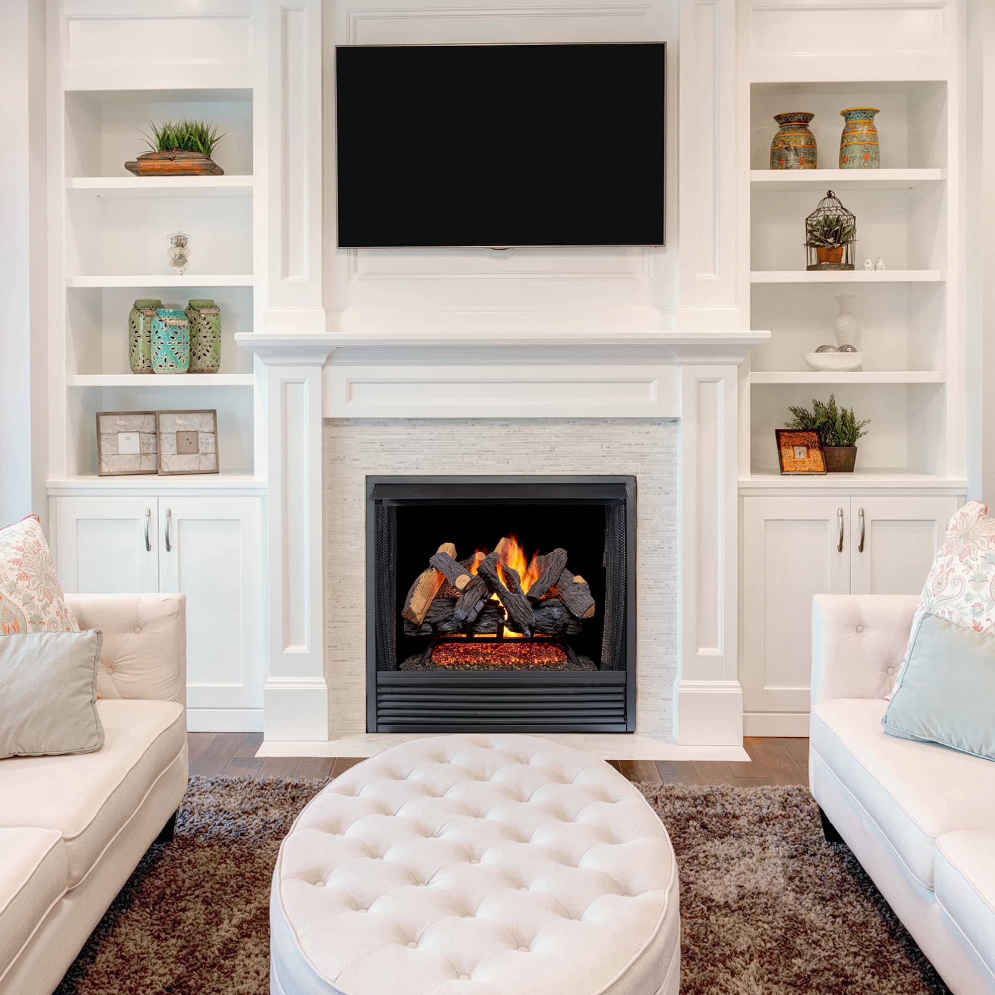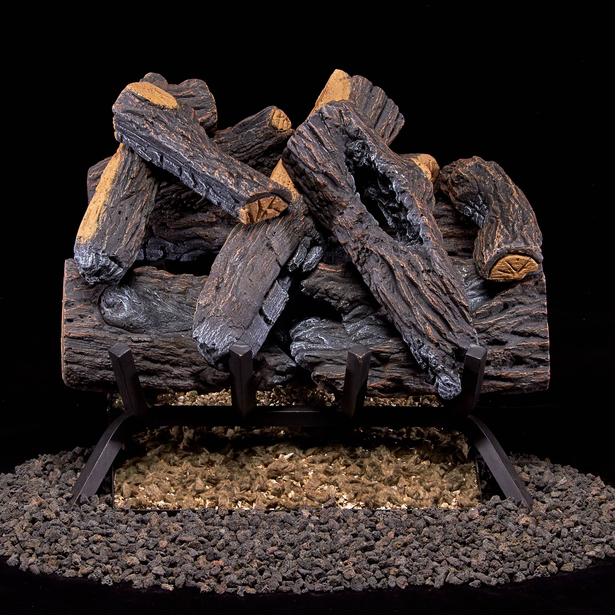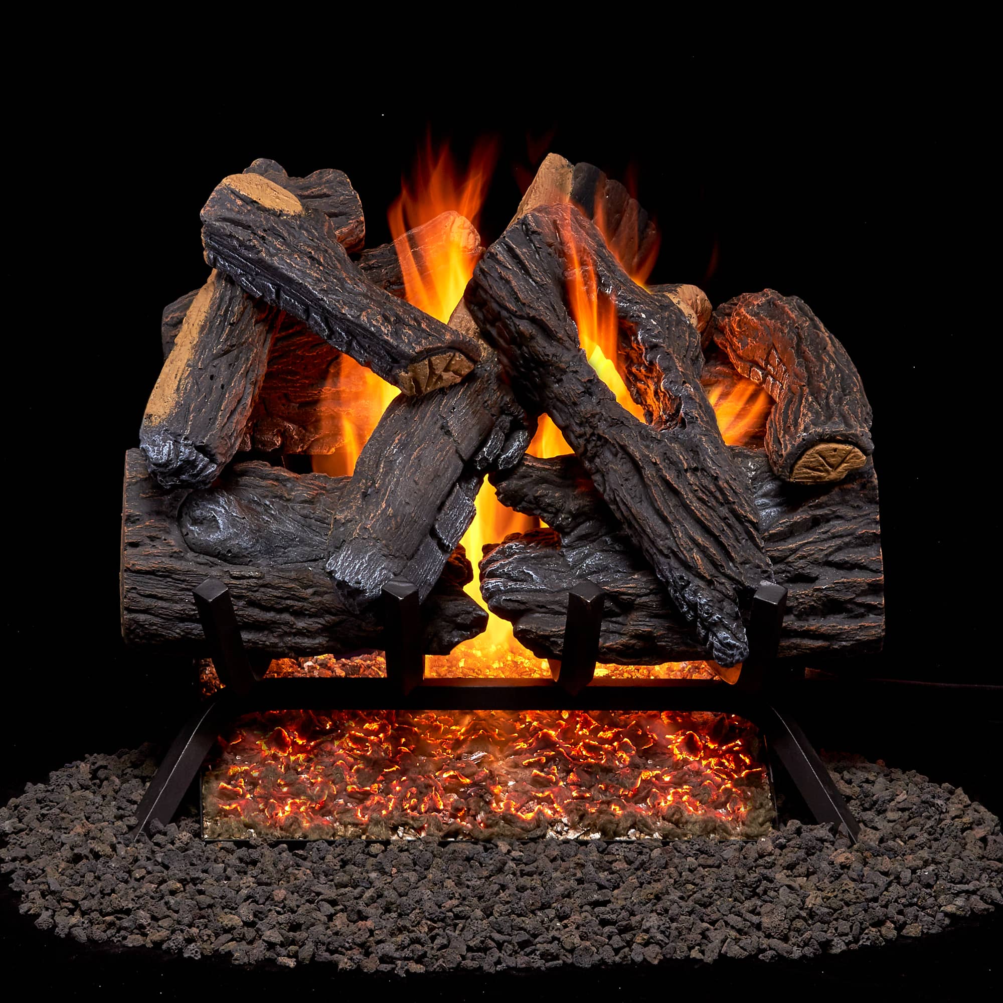 The Heartland Oak Vented Log Set by Duluth Forge recreates the look and feel of a real wood-burning hearth. This Vented Gas Log Set was molded from real wood providing a realistic appearance that incorporates charring, deep bark texture and split accents. The U-Burner chassis design provides multiple rows of flames which brings you the most realistic flame patterns. Like a real wood burning fireplace, the Heartland Oak requires a fully functional chimney with an open flue when in use. The glowing embers create the most illuminating beauty of a warm and classical ambiance. This kit consists of a vented indoor gas log set model FNVL18-1 and an on/off remote control kit model VLRK-OO.