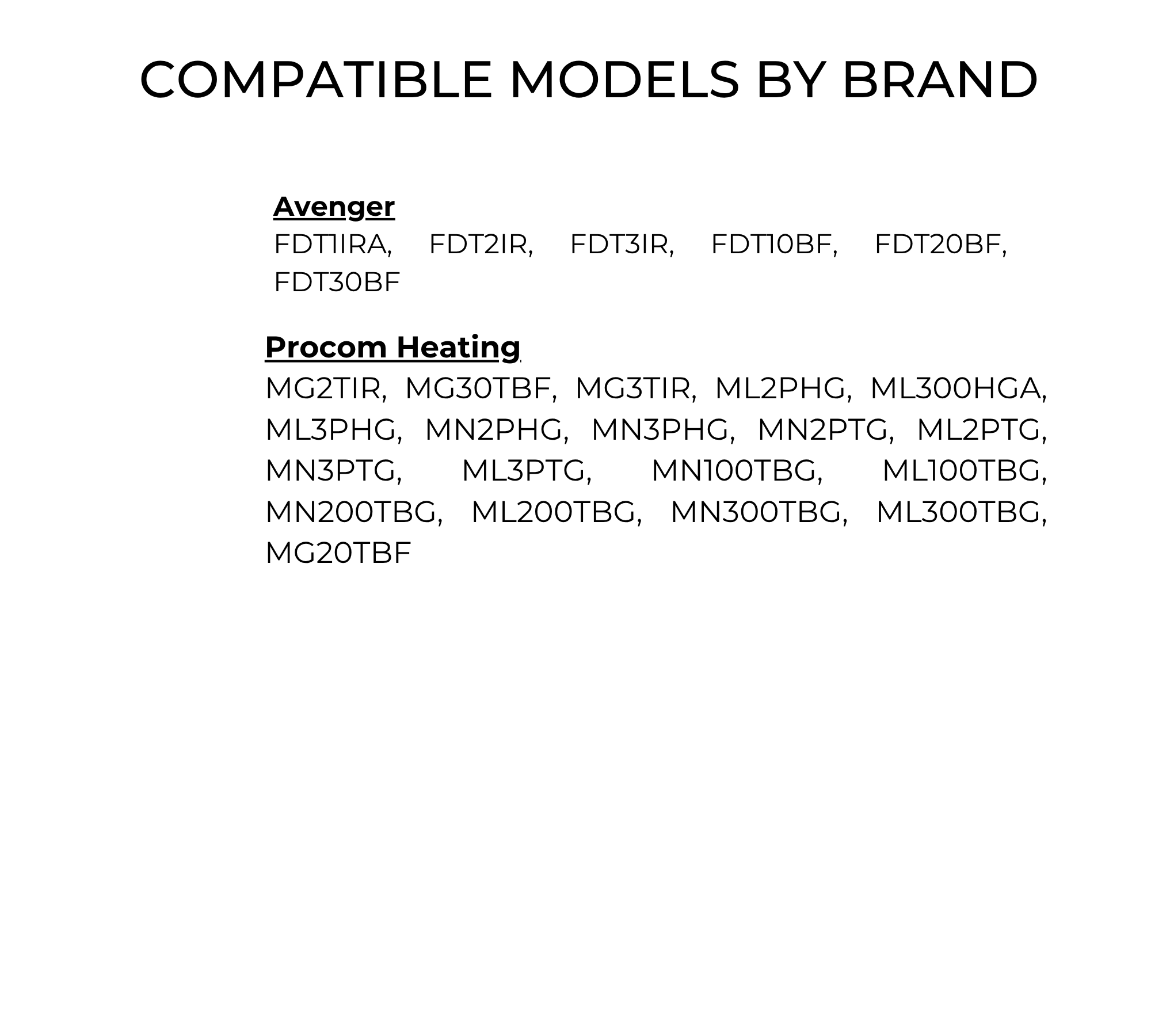 · Compatible with the following Procom Heating vent-free wall heater models: MG20TBF, MG2TIR, MG30TBF, MG3TIR, ML2PHG, ML300HGA, ML3PHG, MN2PHG, MN3PHG, MN2PTG, ML2PTG, MN3PTG, ML3PTG, MN100TBG, ML100TBG, MN200TBG, ML200TBG, MN300TBG, ML300TBG