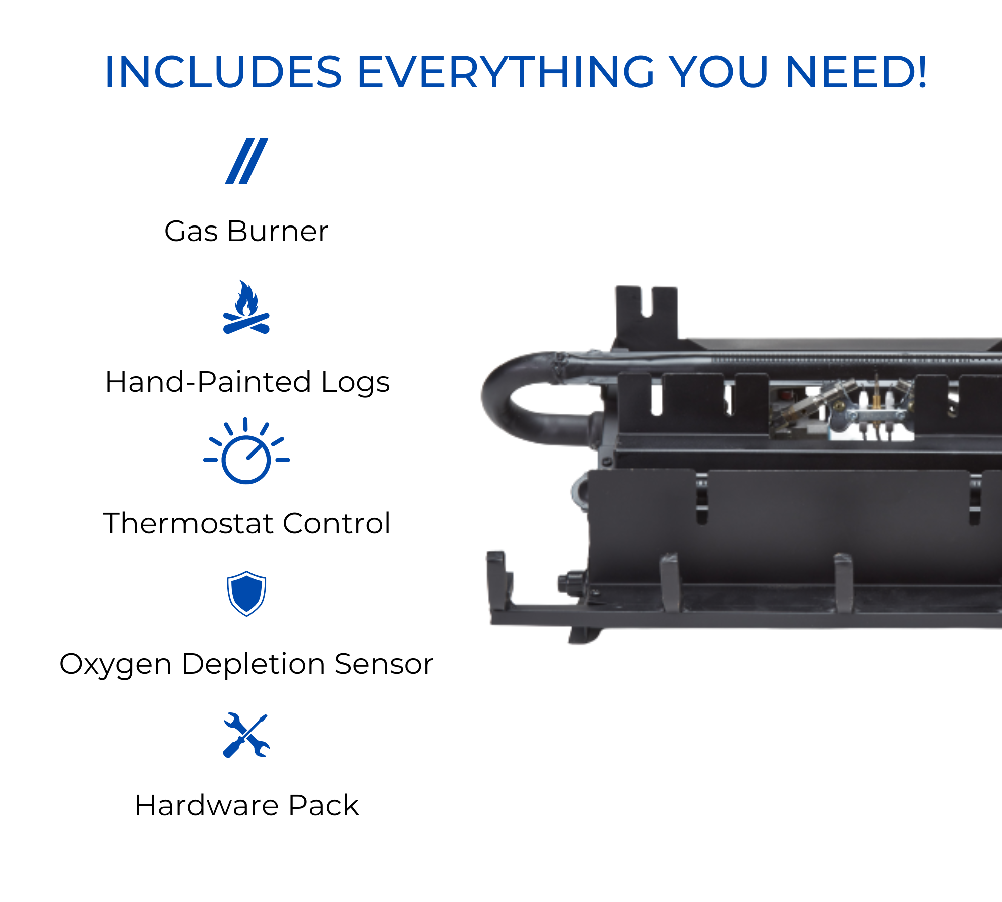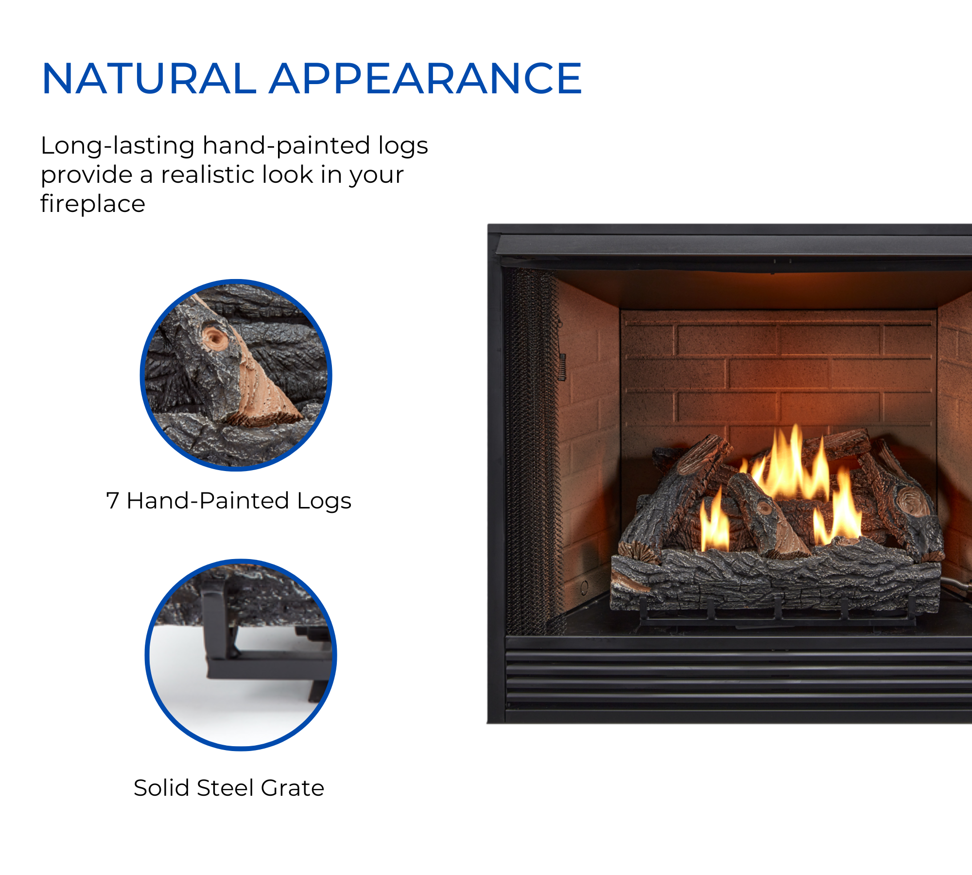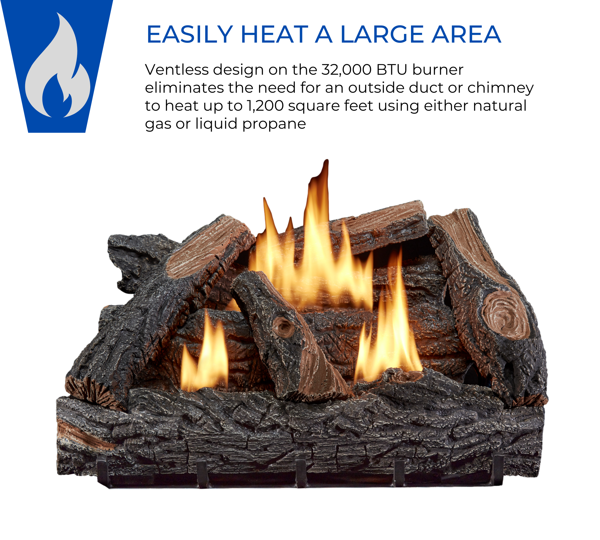 The Hearth Sense Vent Free Log Set features Patented Dual Fuel Technology which allows you to purchase this log set to use with either LP Gas or Natural Gas. This rich, hand-painted, cement log set made of superior refractory ceramics provides excellent details, emulating the realism of a wood fire. During the burn season and in the off season, the log set is an attractive accent to any room, creating an exquisite look to your fireplace and magnifying the beauty of your home. The easy to use Thermostat Control feature regulates the fireplace to maintain the perfect heat setting for your home. This vent-free product may be used as a vented product. To operate as a vented product you must always operate the log set with the chimney flue damper open. You must install the damper clamp (included). This will insure vented operation. Provides 32,000 BTU heats up to an area of 1,200 sq. ft Thermostat control allows you to keep a constant room temperature, without the hassle of a manual adjustment Patented dual fuel burner can be operated on either natural gas or liquid propane Item ships from manufacturer pre-set for liquid propane, please follow the simple step listed in the instruction manual for natural gas operation 100% carbon monoxide and oxygen depletion safe, safety pilot light and oxygen depletion sensor included Vent-free product may be used as a vented product, to operate as a vented product you must always operate the log set with the chimney flue damper open, you must install the damper clamp (included), this will insure vented operation