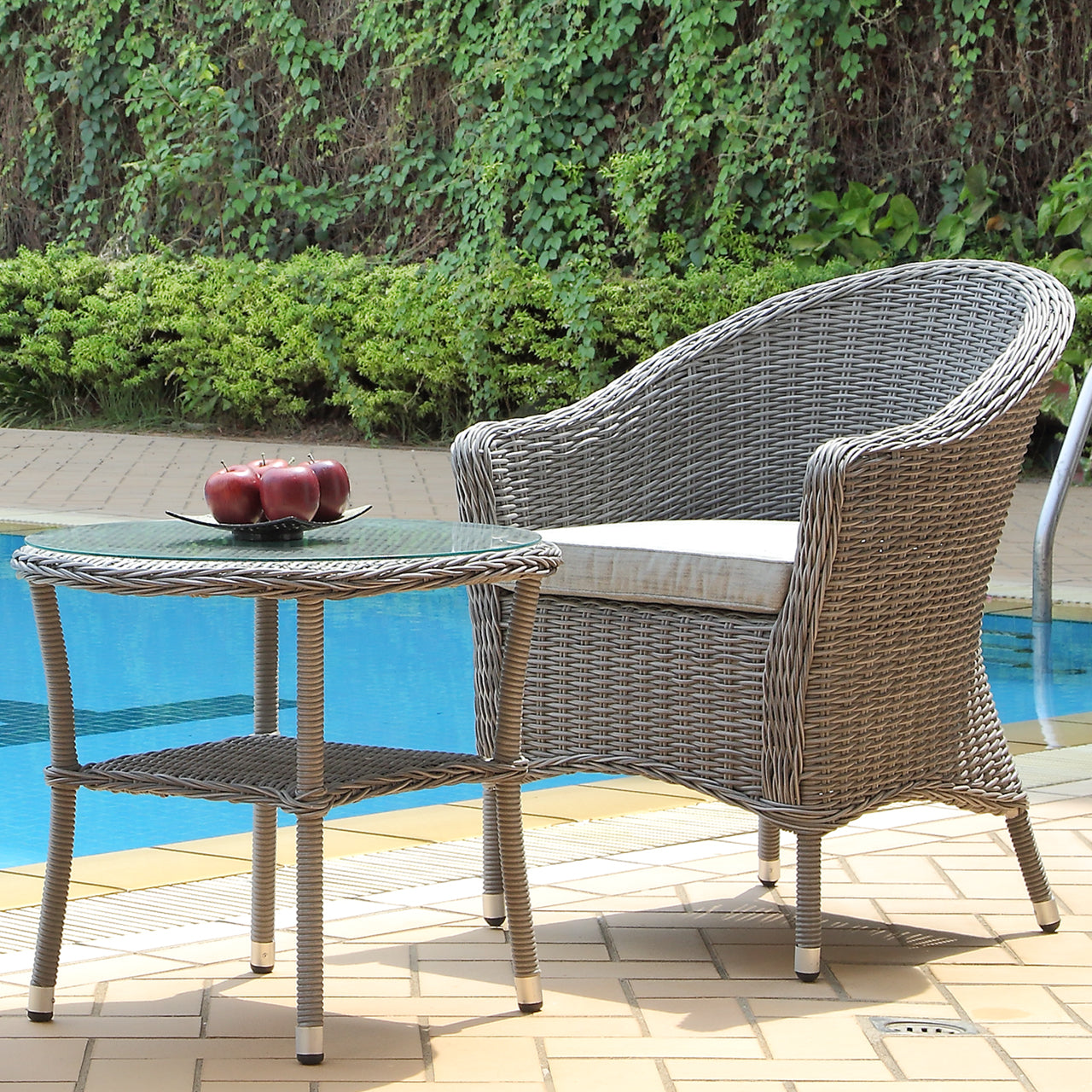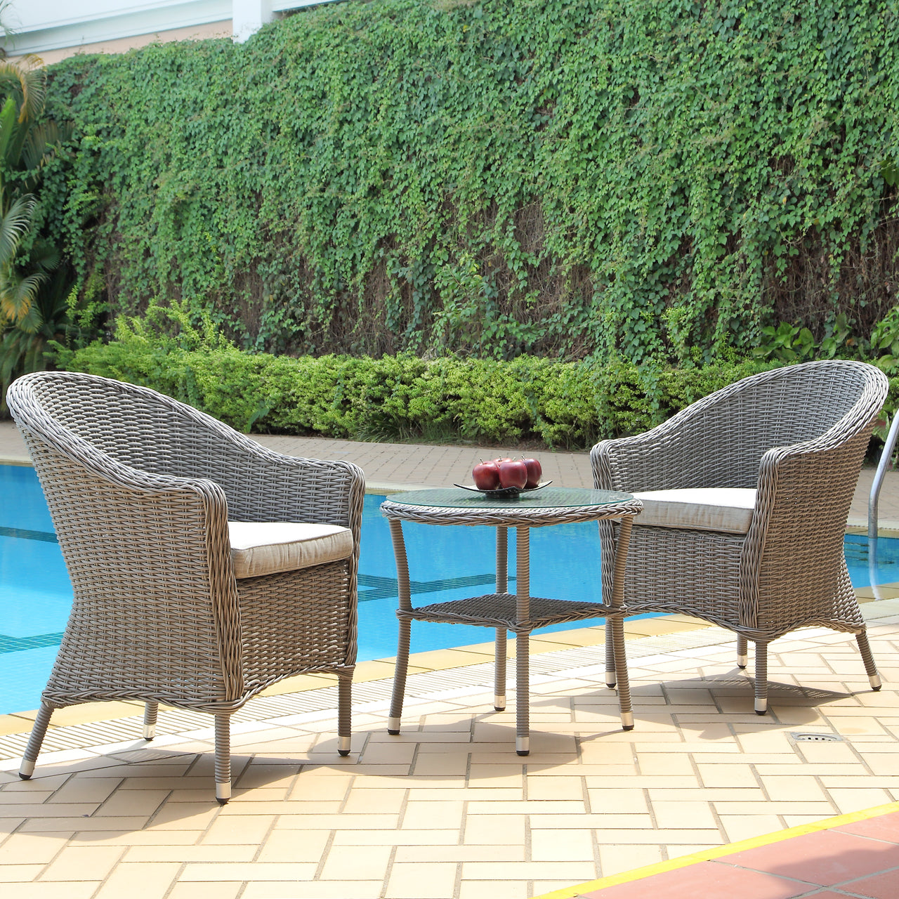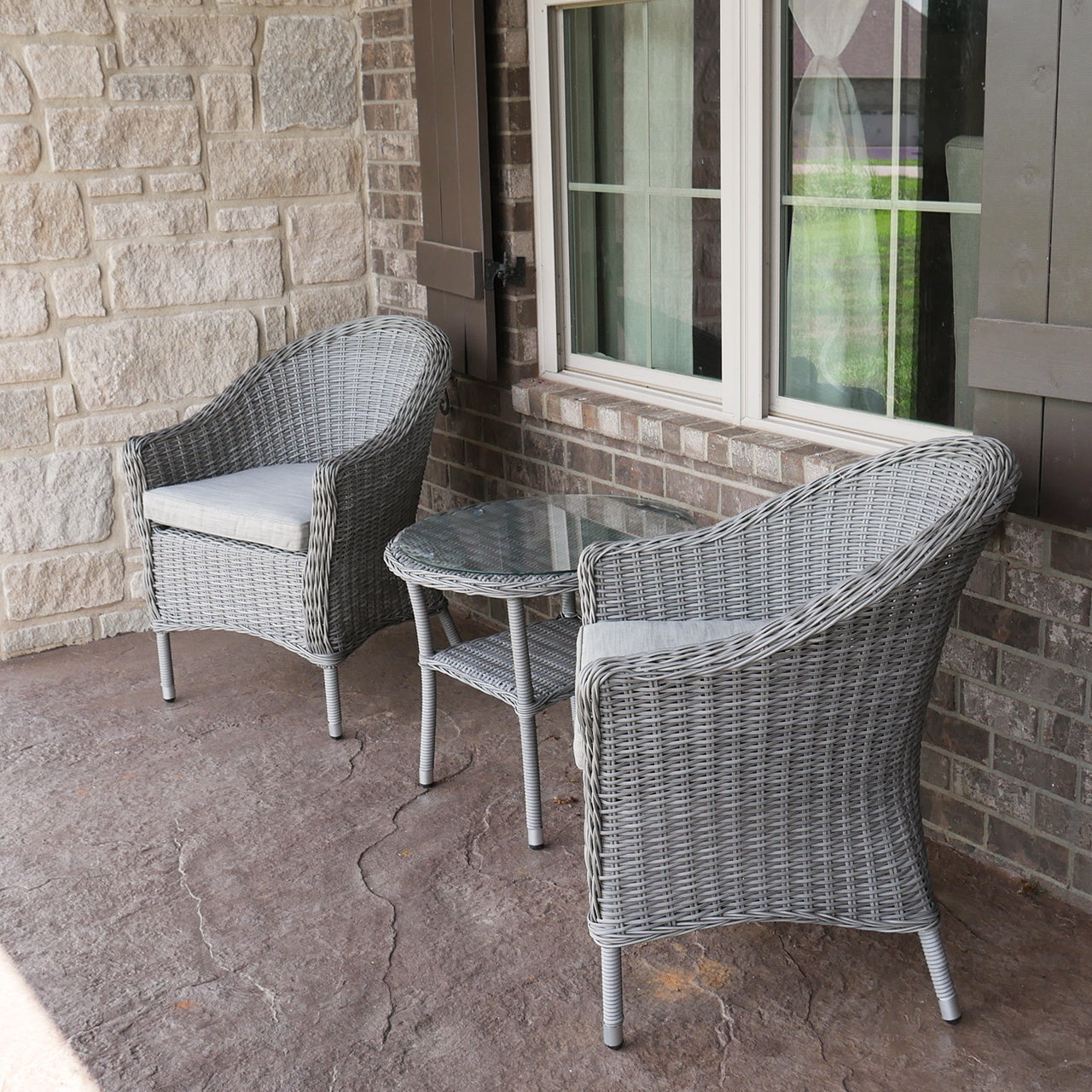 The Pleasant Bay 3-Piece Outdoor Synthetic Wicker Patio Bistro Set is the perfect place to sip your morning coffee from the comfort of your own home. This set includes two high back armed chairs with plush cushions and a table with a glass top. This Patio Bistro Set is ideal for your backyard, terrace or patio. Made suitable for outdoor use, this set features durable construction of weather-resistant, synthetic wicker and aluminum framing for durability. All pieces are hand woven using a half round and round style wicker which creates a visually appealing and high quality finish.