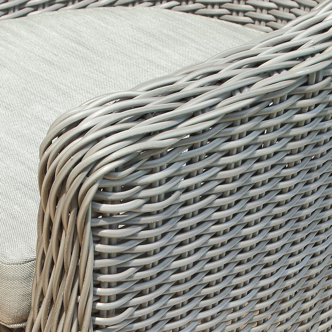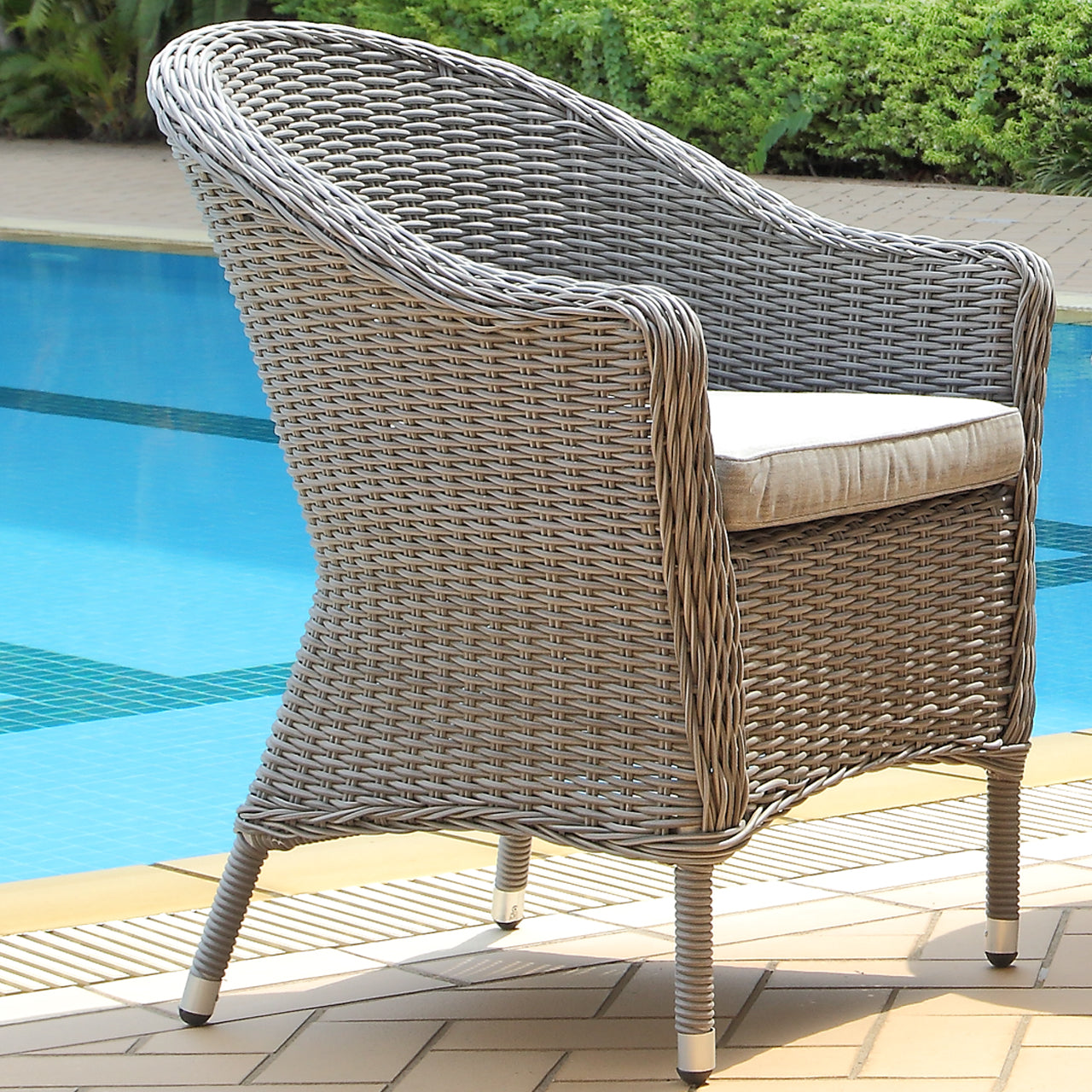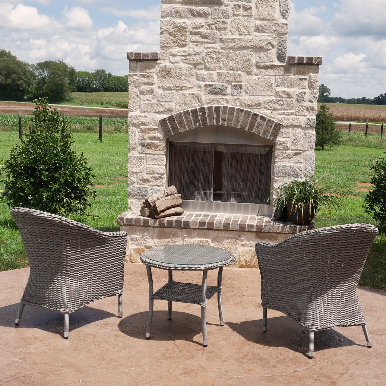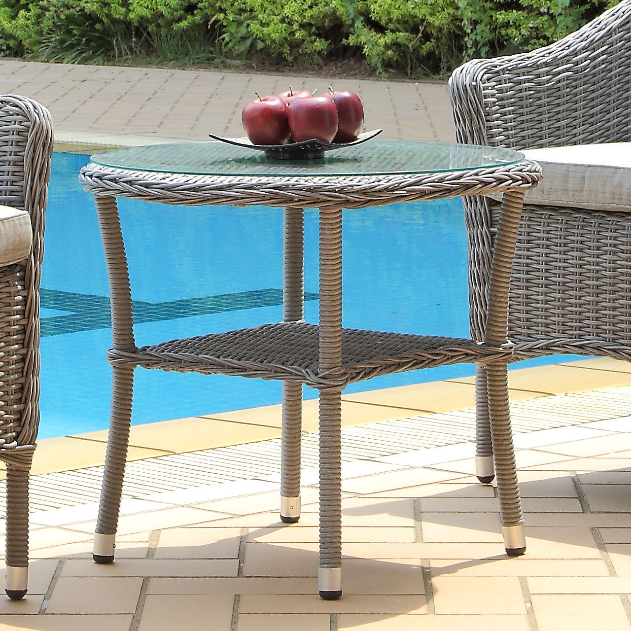 The Pleasant Bay 3-Piece Outdoor Synthetic Wicker Patio Bistro Set is the perfect place to sip your morning coffee from the comfort of your own home. This set includes two high back armed chairs with plush cushions and a table with a glass top. This Patio Bistro Set is ideal for your backyard, terrace or patio. Made suitable for outdoor use, this set features durable construction of weather-resistant, synthetic wicker and aluminum framing for durability. All pieces are hand woven using a half round and round style wicker which creates a visually appealing and high quality finish.