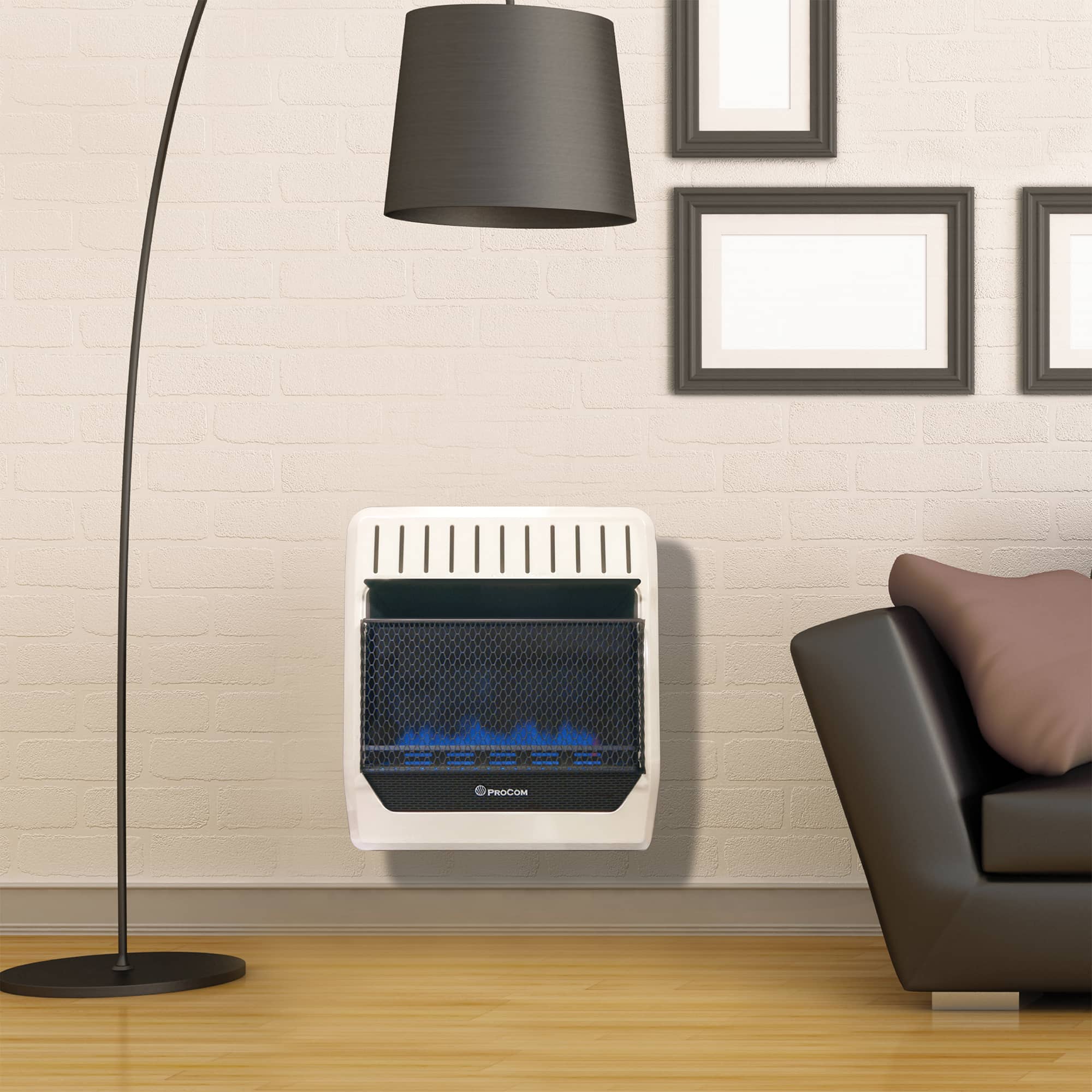 ProCom Ventless Propane Gas Blue Flame Heater Model# ML200TBG is built for durability and efficiency to keep your home toasty warm for many cold seasons to come. This compact but solid heater gives you a reliable source of heat. It runs at 20,000 maximum BTU which heats up to 950 square feet of living space. No electricity is required which is perfect for power outages or any in-house urgencies.
