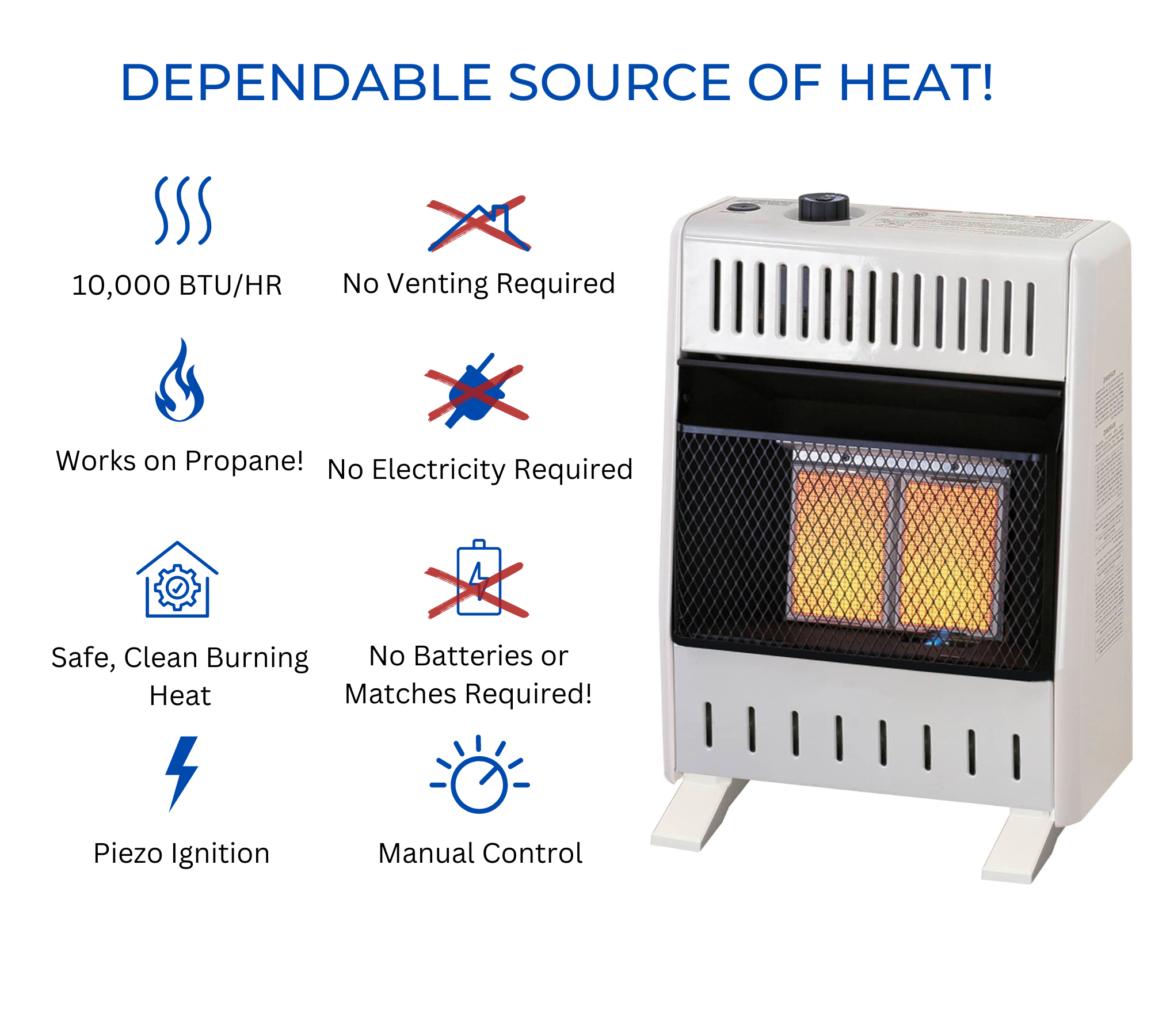 The ProCom Heating Infrared MA Series of Vent Free Heaters delivers reliable heat and offers an easy way to add an extra heating source to your home. The heater has an easy push-button start with no electricity required, making it a great choice during power outages. The manual heat settings allows you to maintain and control the desired heat output, while the oxygen depletion sensor features an automatic shut-off design to keep your home safe.
