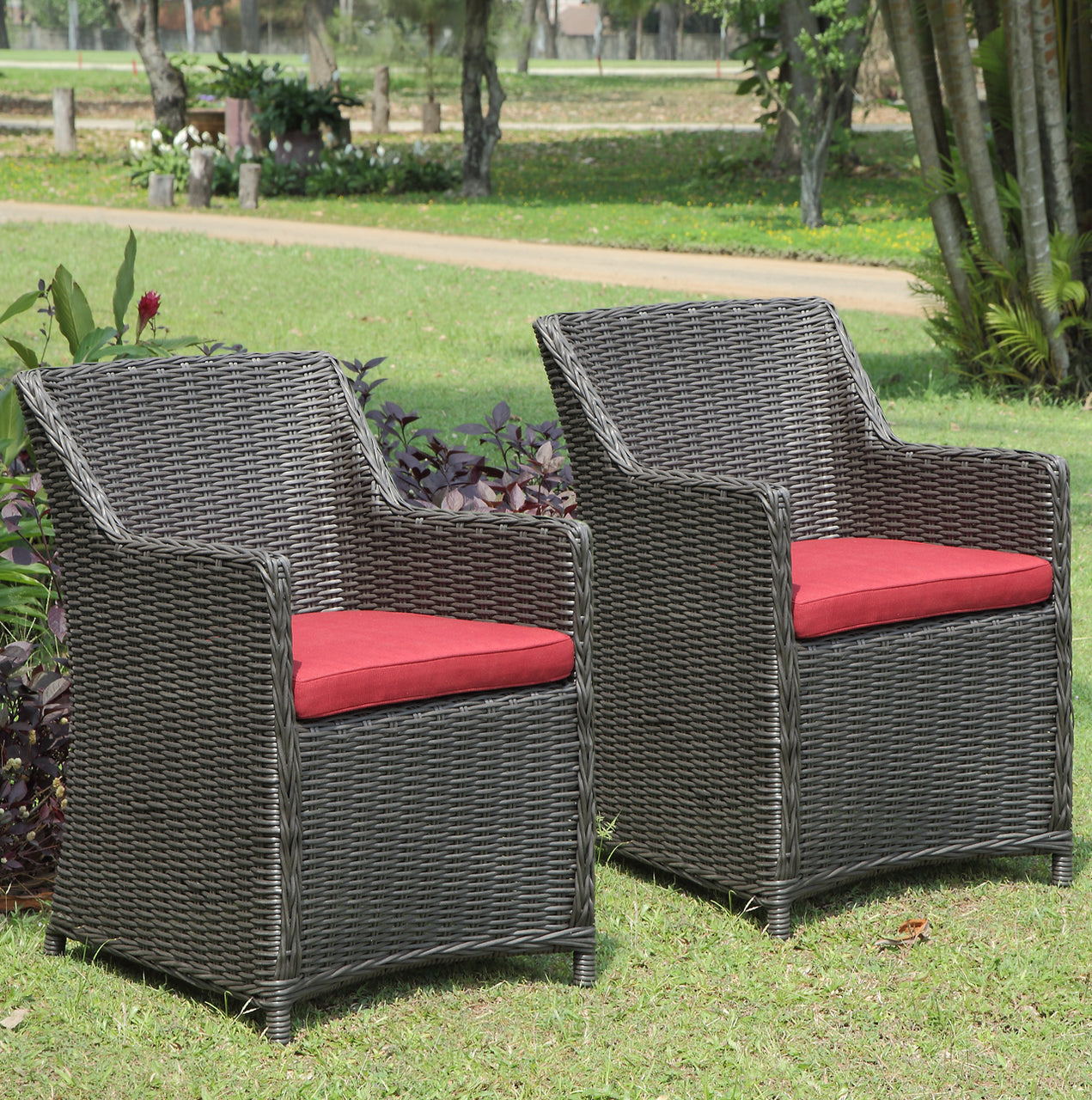 The Sea Island synthetic resin wicker chair set by Factory Buys Direct is an economical solution for upscale seating furniture. These indoor or outdoor conversation chairs or dining chairs are constructed of a synthetic resin wicker in a half rounded dark grey wicker woven over rust-resistant, powder-coated aluminum frames. The chairs are completed with a weather and UV-resistant seat cushion in a red color using quality fabric and foam. Ships Assembled. Set includes two chairs and two cushions.